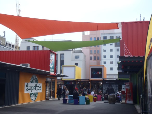 Most of the buildings in downtown Christchurch are demolished by now (because of the February 2011 earthquake), but the open lots made room for a “container mall.” You know those dingy mundane metal boxes that sit on trains, trucks, and barges? Christchurch retailers have cleaned up and dressed up these metal boxes and positioned them into a colorful outdoor mall.