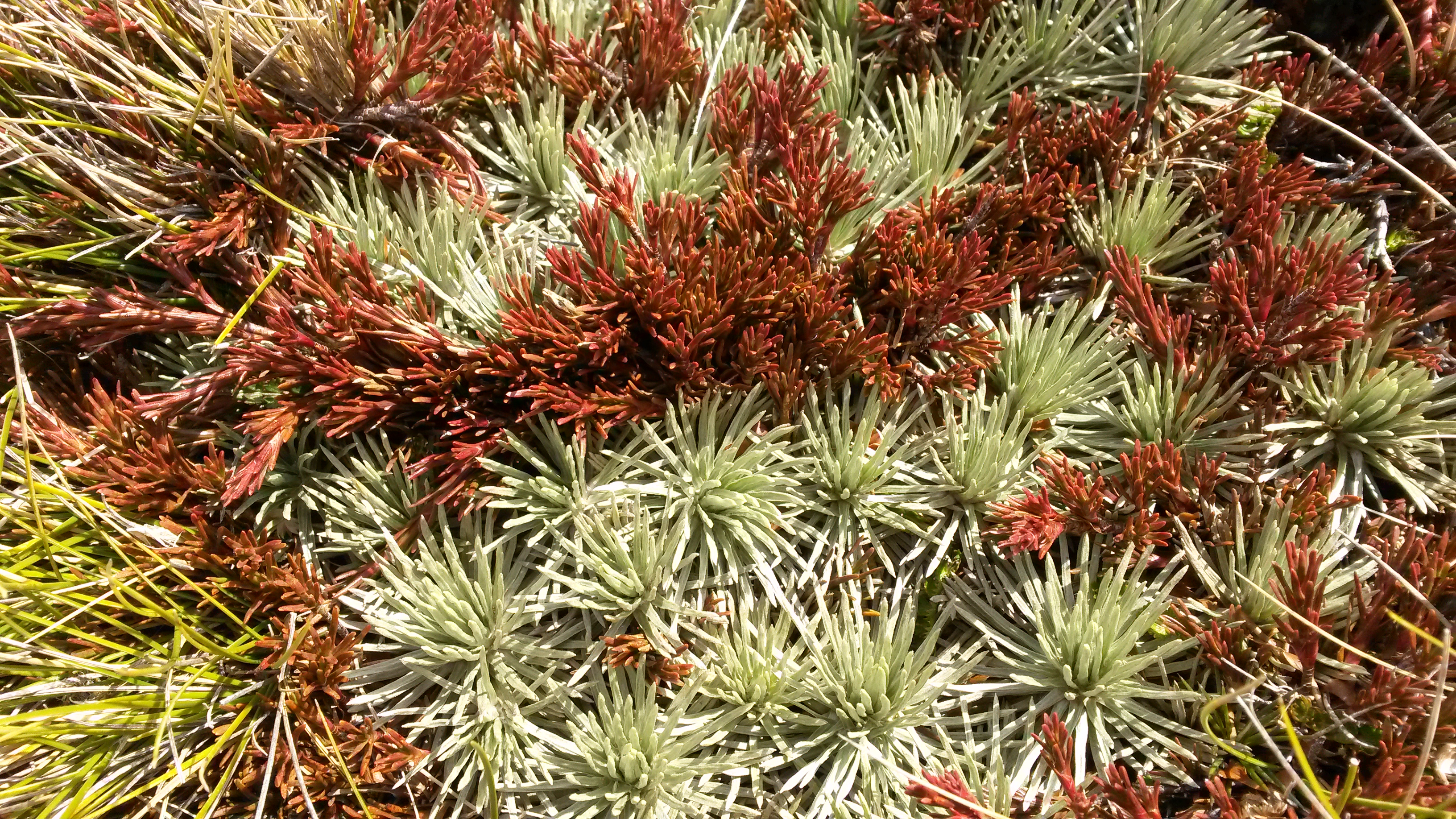 There was no trail over the tops, and I kept hoping that I wasn’t killing these tough little specimens with my boots. They’re tough to wind and snow and sun, but I bet they aren’t durable to foot traffic. Lots of reds in the foliage mix. Maybe they’re anthocyanins protecting leaves from sun damage?