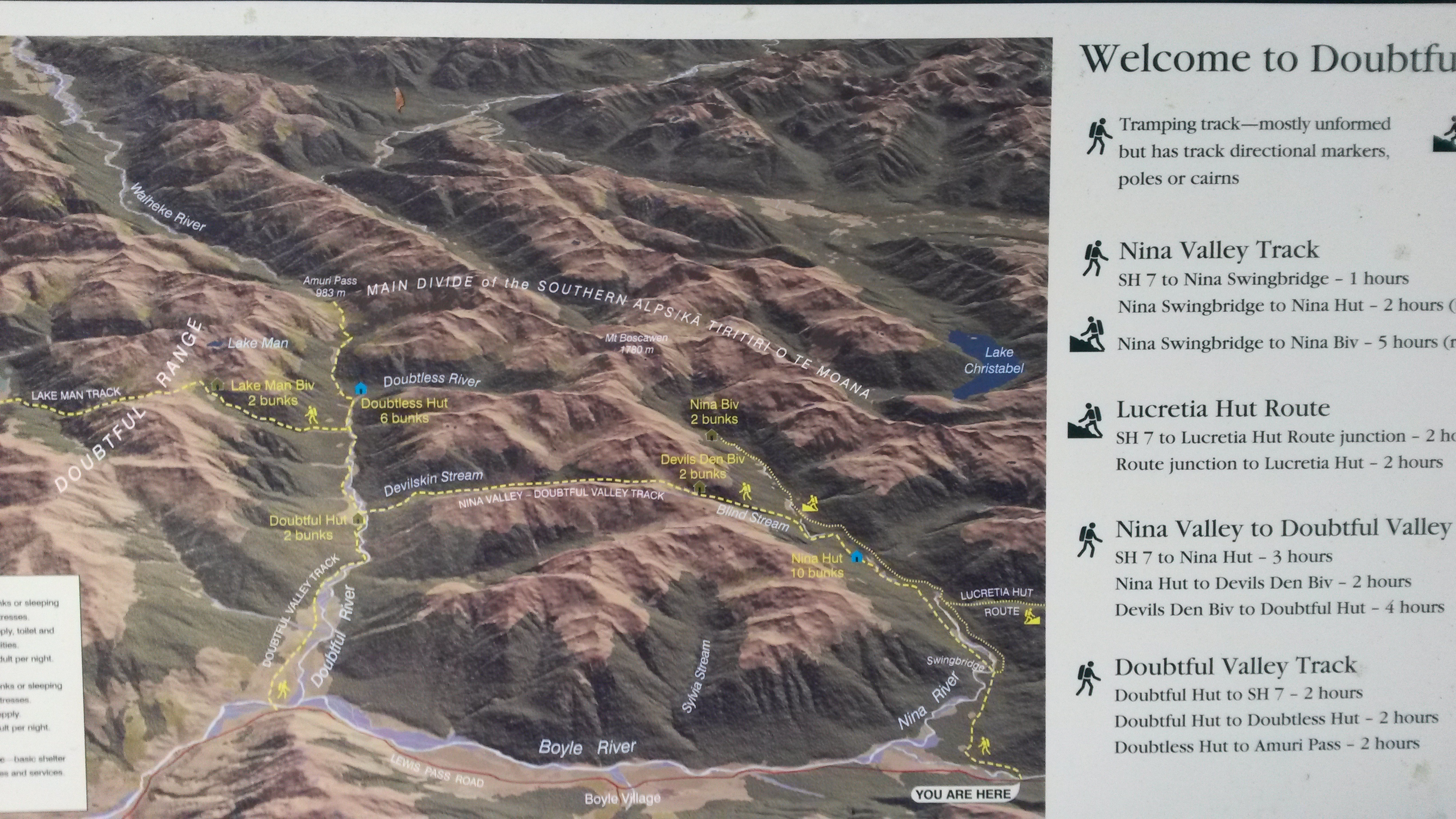 Nina Valley and Sylvia Tops. The hike looked pretty good as described in South Island Weekend Tramps. Most solo weekend tramps mean backtracking back to the car, but this one would be a loop. On the outward leg I’d following a “route” over the Sylvia tops, stay at a tiny hut on the saddle, and walk back out the Nina valley the next day. And I’d avoid the Doubtful valley. Not that I’ve been there or heard bad tales, but the name is a bit ominous.