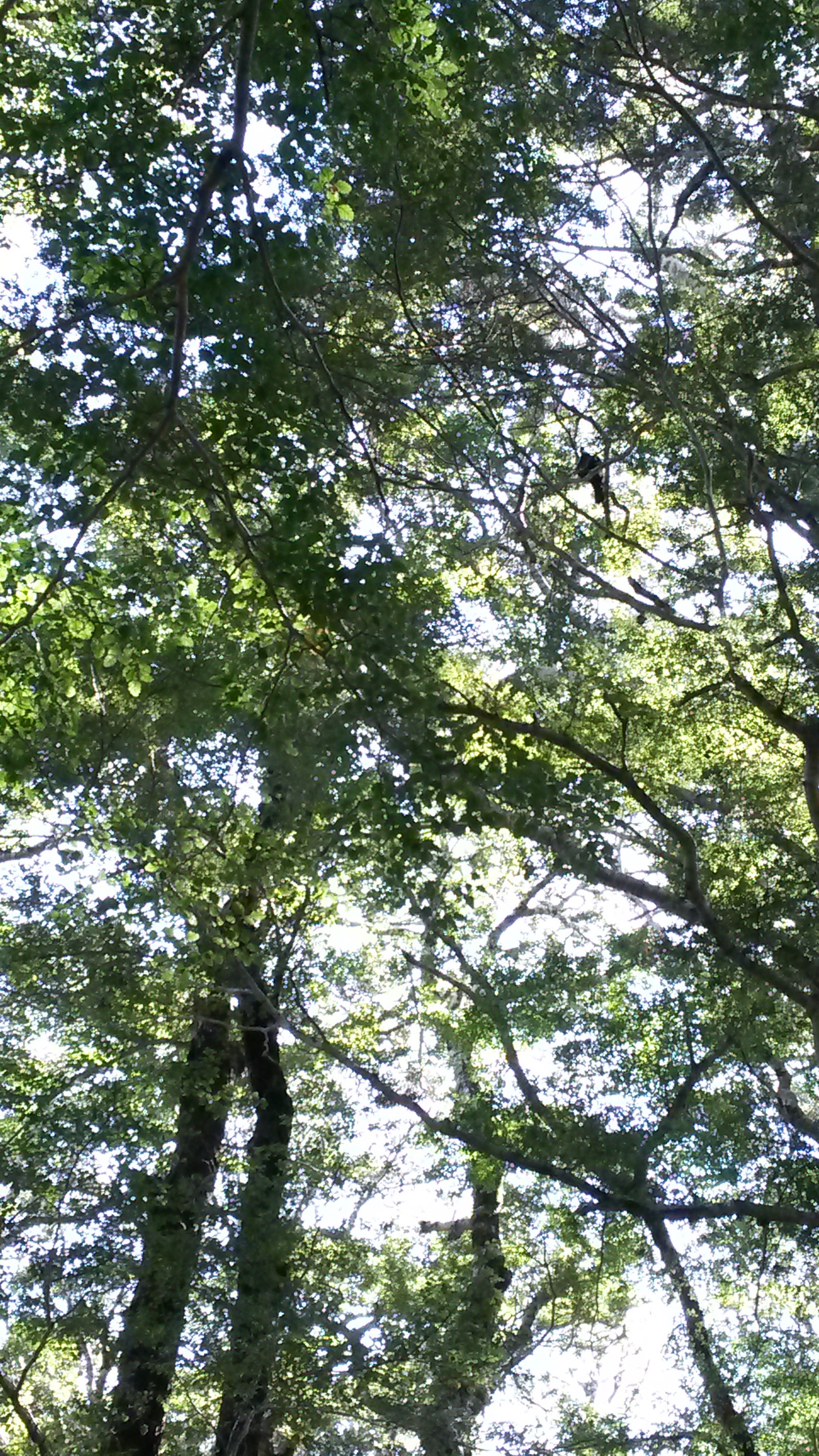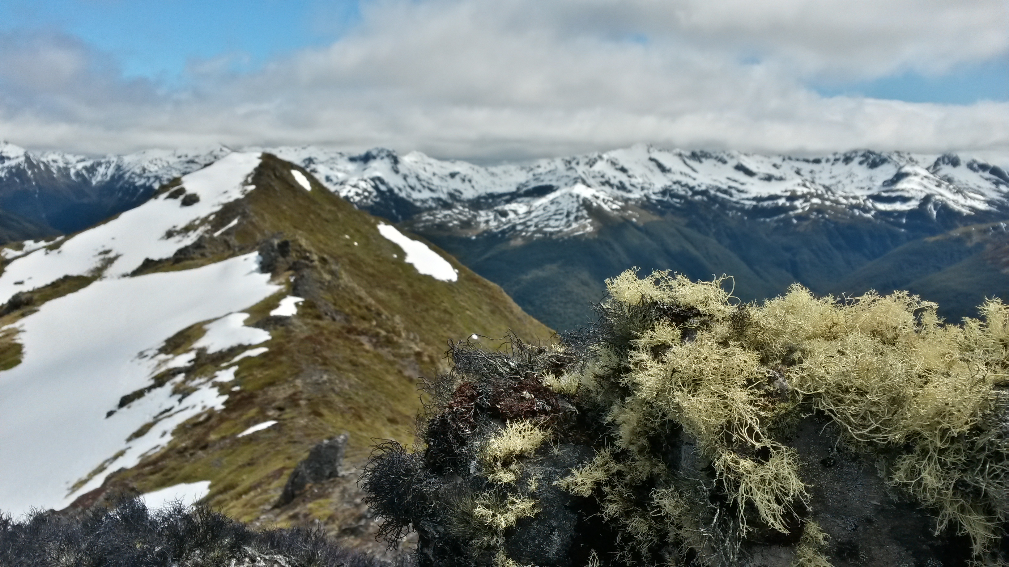 I spent the next two hours looking at moss and beech leaves and scratchy trunks up close. At first I appreciated the lush greenery. Then I remembered that I don’t like bush whacking (or “bush bashing” as they call it here). At certain moments the branches seem malevolent, snatching at my hair and snagging my ice axe. I would find a deer trail only to loose it again. I guess deer aren’t stupid enough to climb straight up hill, like humans. There are distinct advantages to hiking alone–when the going gets tough, there’s no one else to worry about, and I don’t have to apologize about the non-trail or wonder if I should have been on the next ridge over. Just keep going up.