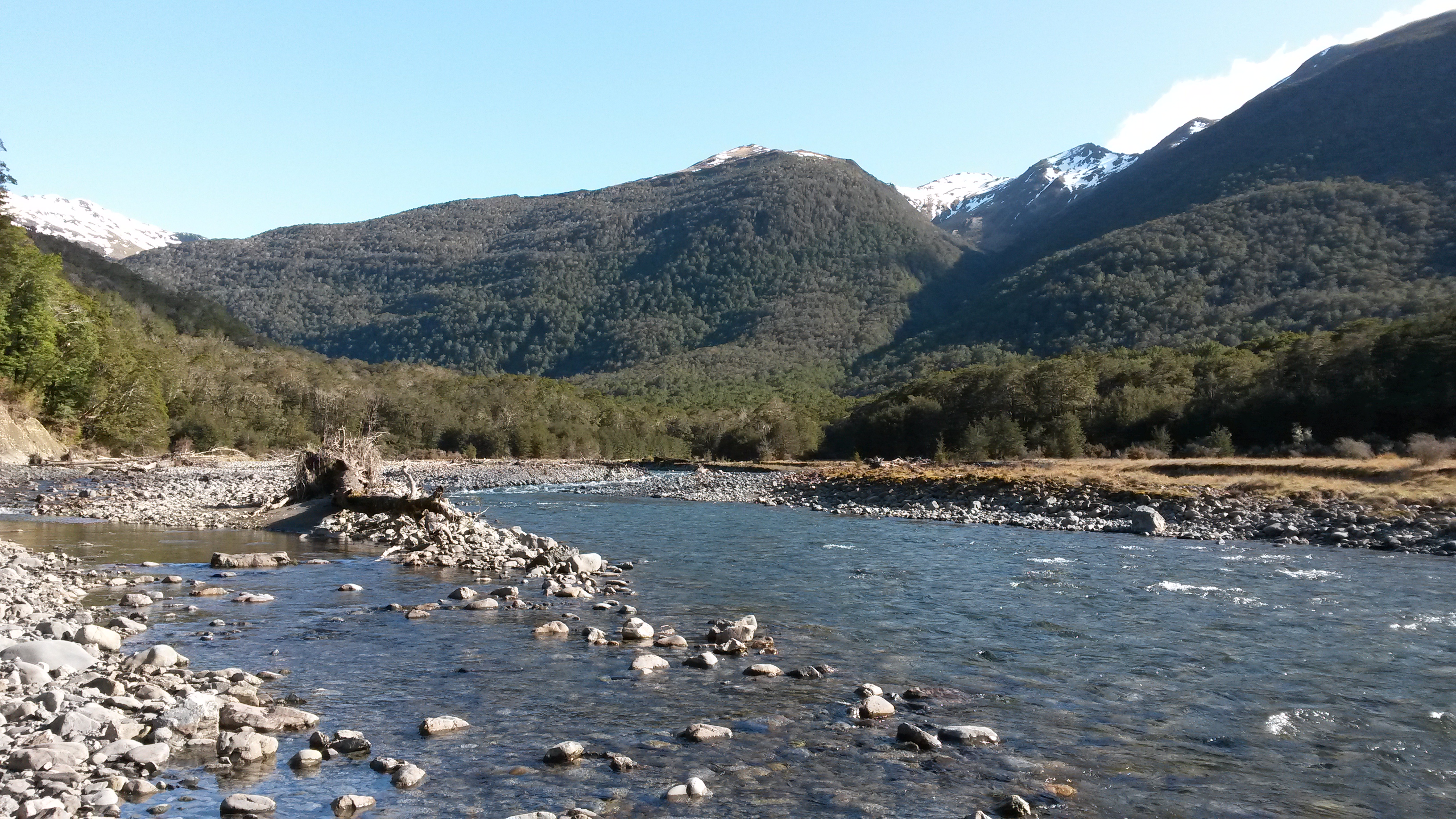 I looked carefully along the trail for any sign of a side path. It’s not a DOC track, so I doubted there would be a sign. At a deer trail I cut over to the river flats and got a good look at the beech-cloaked ridge I had determined to climb.