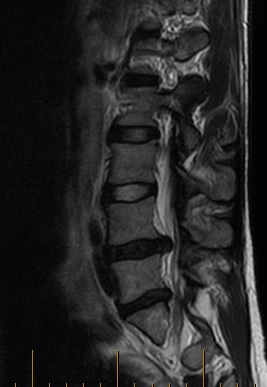 Here’s the whinge: Somehow I have a “bulging disk” in my back pushing on a nerve, causing pain from my hip to my toes. See that black thing between the vertebrae? It’s supposed to be a tidy little balloon staying neatly between the bones, not a jelly-filled donut with the jelly squeezed out.