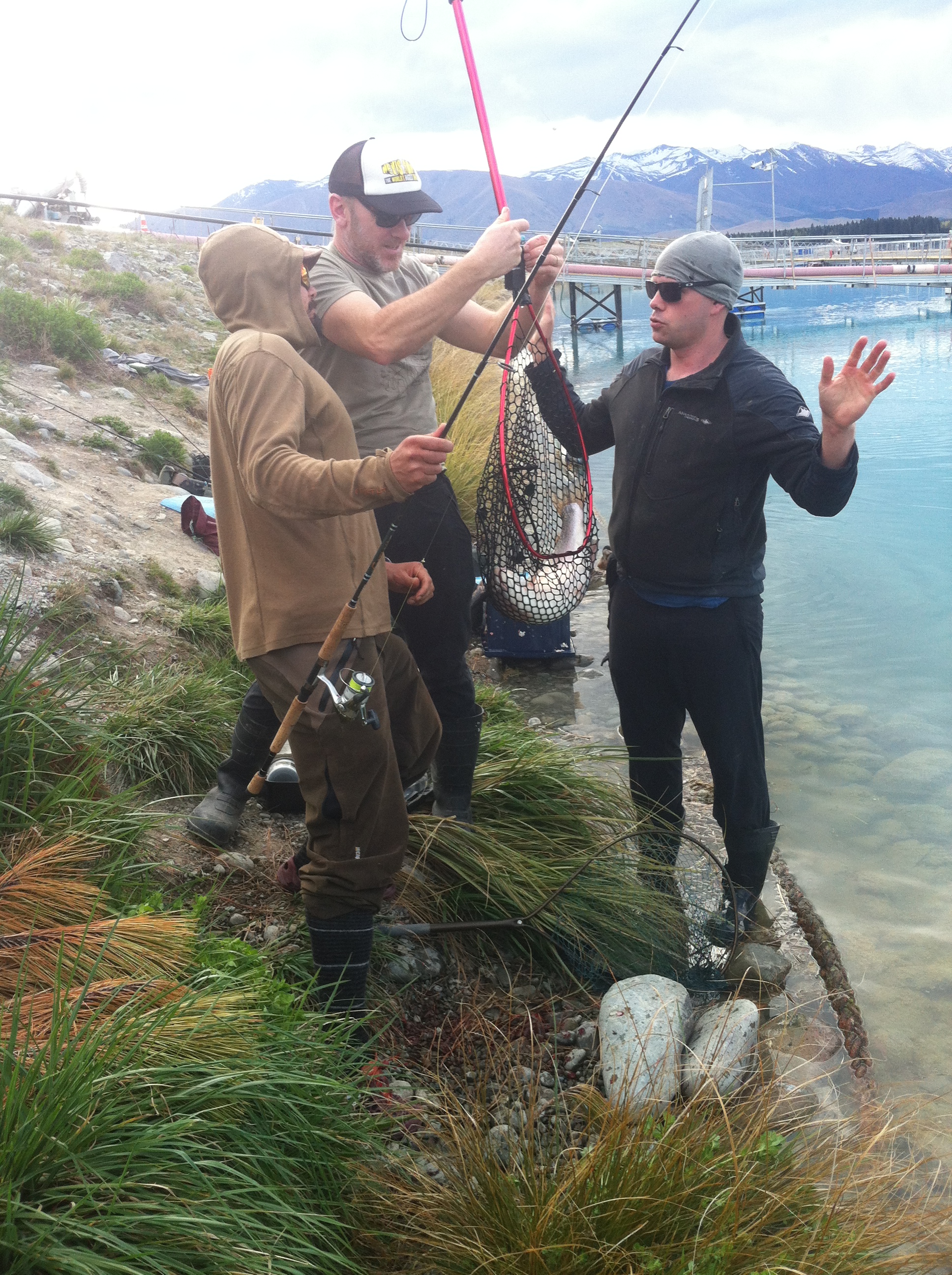 “Whew, that’s it’s real weight, mate. I ain’t touching the net!” The men admire a 20 lb fish, a trout in this case. The rainbow trout have decided that right under the salmon nets is pretty good pickings, so it was mostly trout that they caught this weekend. Massive fat trout.
