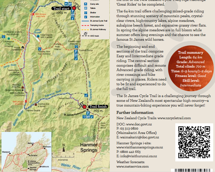 DOC’s map shows the cycleway, 64 kilometers of mountain biking through the sweeping Waiau river valley. We concluded that the difficulty of the ride was exaggerated somewhat in the description–DOC must feel responsible keep inexperienced bikers from getting in over their heads.
