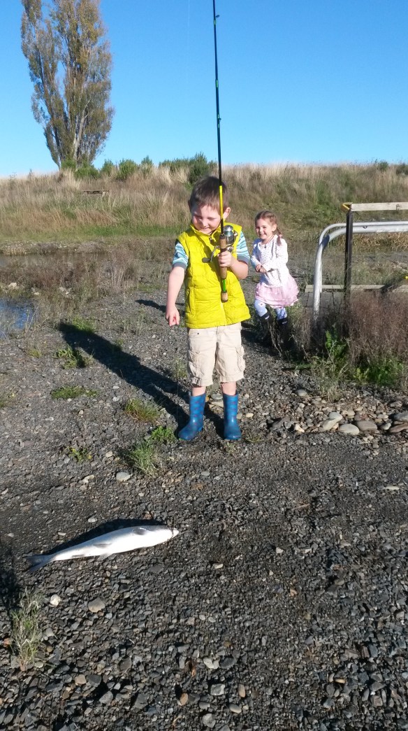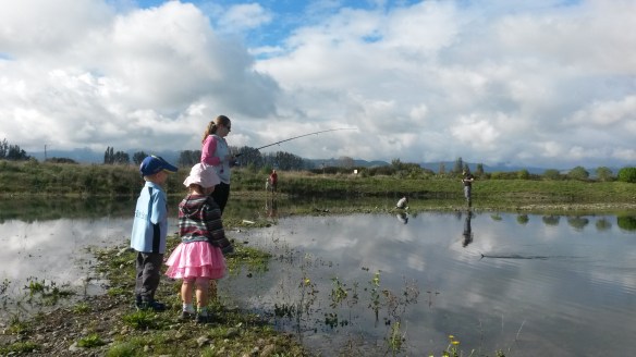 Saturday dawned gloriously and we went with Ben and co. to some fishing ponds near the Waimea River. (Ben is Jeremiah’s hunting buddy who lives in Christchurch, but was up with his family the Grandparent Homestead near Nelson.)