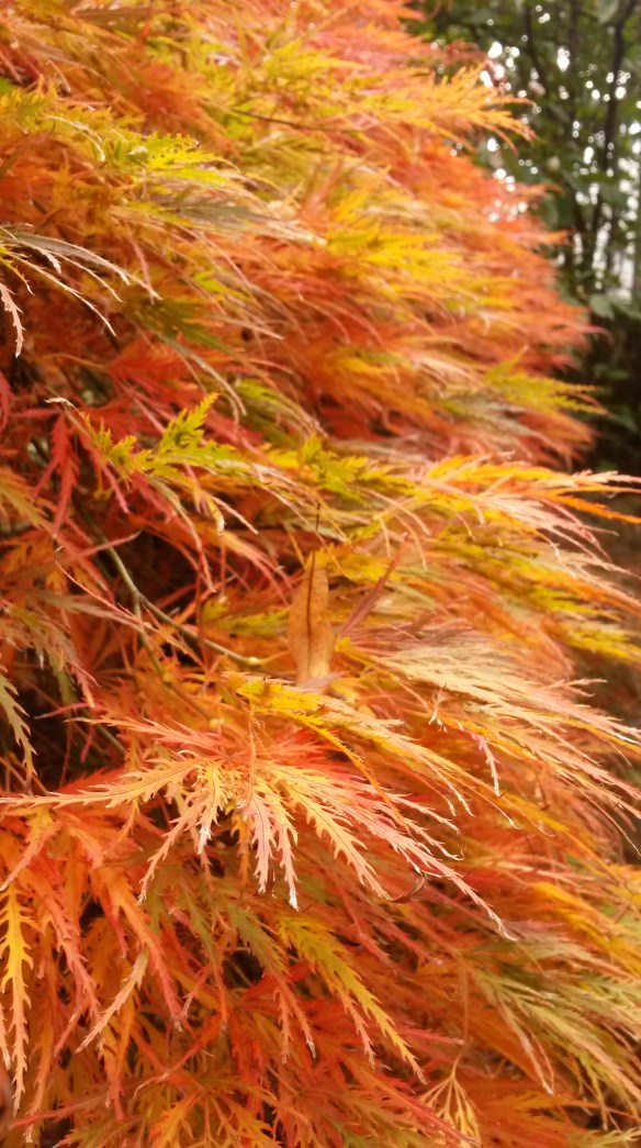 Japanese maple, in fall glory. I once when I was in college I sent a pressed Japanese maple leaf to my grandmother, and she wrote back wondering if I had sent her a marijuana leaf. The subsequent letter included both a maple leaf and a marijuana leaf (it doesn’t take much figuring to guess which classmates to ask for said leaf). I still giggle every time I admire these frilly maples.