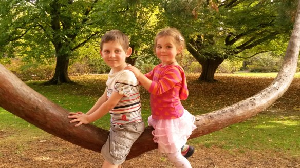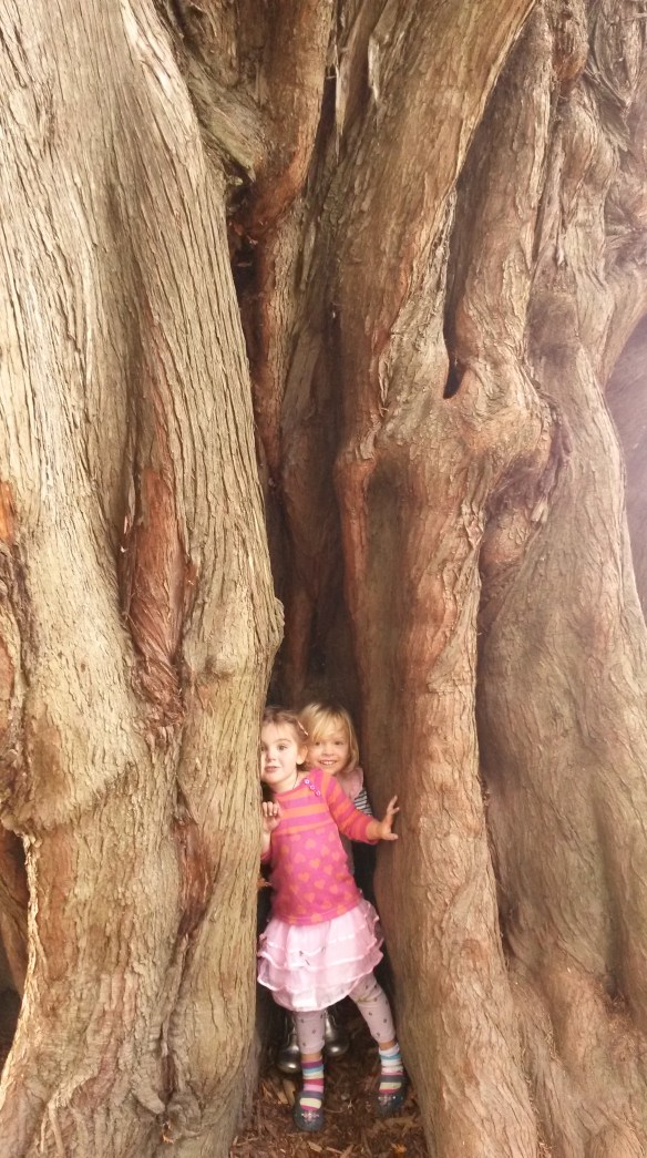 Naomi and Stella tucked themselves away in the tree crevice to hide. The botanical garden has some great specimens.