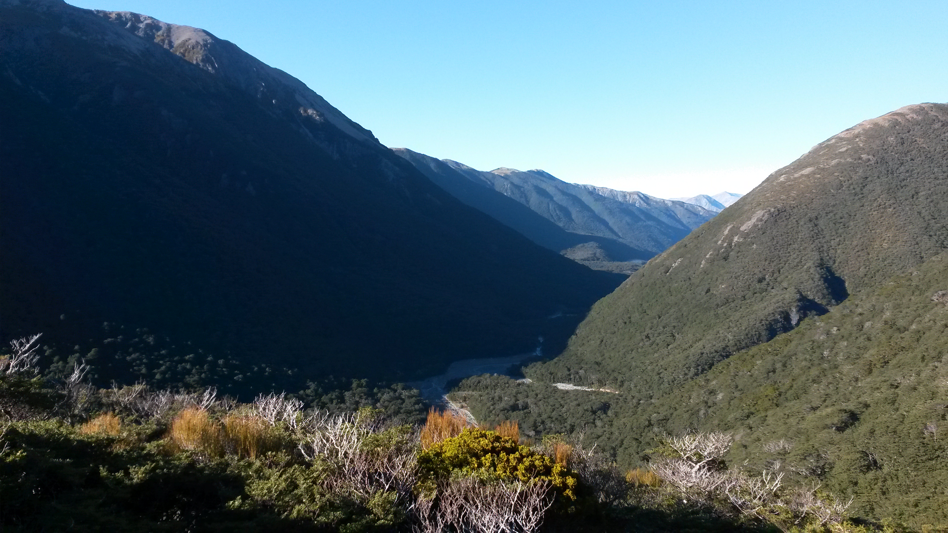 20170506_095743 Published May 7, 2017 at 3264 × 1836 in Alpine again: Hawdon to Edwards We climbed in the dappled sun through the beech trees until we reached the alpine zone. The hut would be somewhere on the right of the valley there.