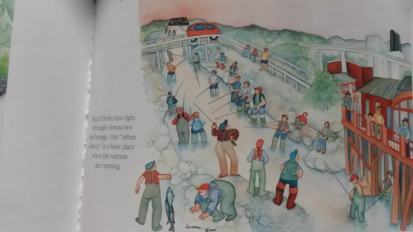 20170805_144947 Published August 5, 2017 at 2048 × 1152 in Alaska distilled Barbara Lavallee is an Alaskan artist who I love. Her characters look so cheerful and full of happiness and wonder. Here’s her take on salmon season in Anchorage. Pretty spot on for Soldotna too.