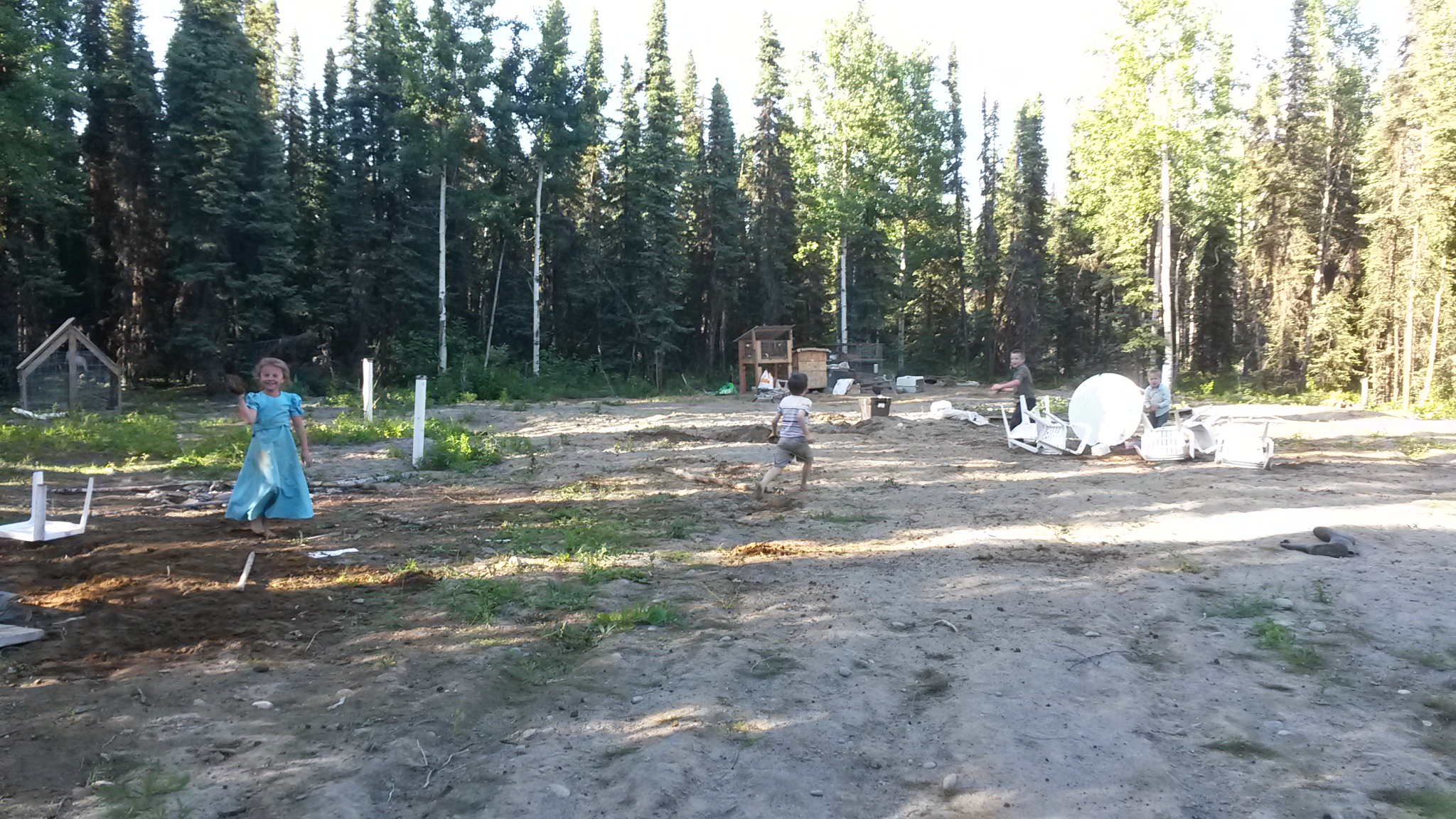 Ben and Jeannette have about an acre of sandy land carved out of the spruce forest, at the end of a dirt road, 20 minutes from town. Lots of Alaskans like to live this way, apparently….the Alaska version of a suburb is a house ringed by spruce trees, hopefully far enough from the neighbors that you don’t see them often. Here kids were in the midst of a dirt fight in the back yard. Plastic tables and chairs were a barricade which was being stormed at close range by the opposing team. “Um, that looks like fun,” I ventured, wondering that no one had their eyes packed full of sand. “Why don’t we come in, run through the showers, and play some Uno.”