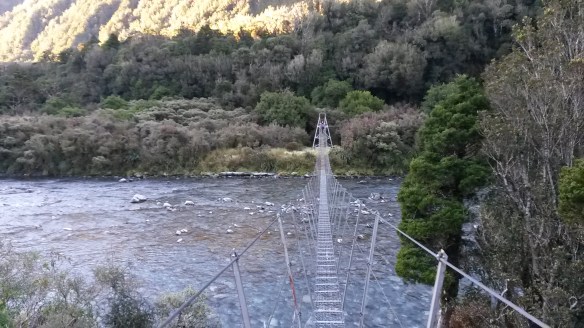 Just before the hut is the longest wiggliest swing bridge I’ve ever crossed. Not that I’m complaining! It sure beats wading the river, and we saw a pair of whio (rare NZ blue ducks) from the vantage point of the bridge.