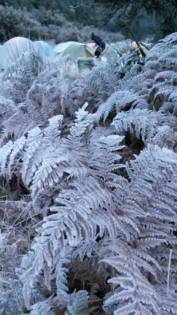 We set up our tent in the field, then sipped our tea before strolling up to the hot pools, which were on a side stream above the hut.  “People soup!” Carrie chuckled, as we tried to guess how many of our fellow trampers were already thronging the pools.  As it turned out, we got a turn in the pools while they were quiet.  When we got back, the whole field was covered in tents.
