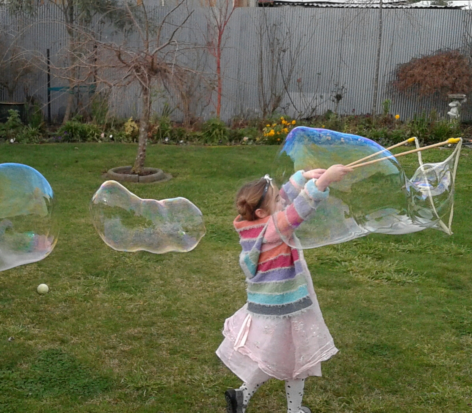 Birthdays–theirs and others–are a highlight of the childhood years. These giant bubbles were at a recent party. They are so alluringly strange; quivering iridescent blobs floating genteelly about the yard until pounced upon by little girls in fancy dresses.