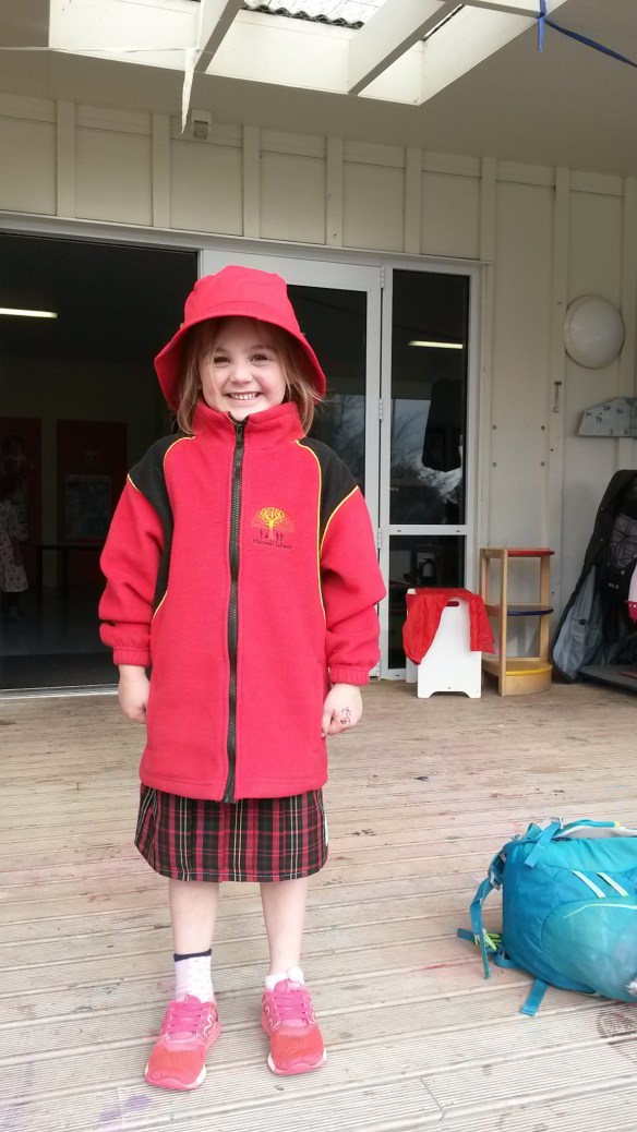 She’s starting with 12 other new kids, a huge intake for one week.  The teachers’ ability to learn faces and names is absolutely incredible.  Her teacher is starting back at school the same week she is, having been a New Entrant teacher at Halswell some years ago, then taken a break to be a librarian and a professional actress at the local theatre.  She was wearing a pink polka dot dress with a teal ruffle, pink bobble bead earrings, and red lipstick.  Her bubbly actress persona is infectious.  She’s any little girl’s dream teacher.  Heck, I want to go back to kindergarten!