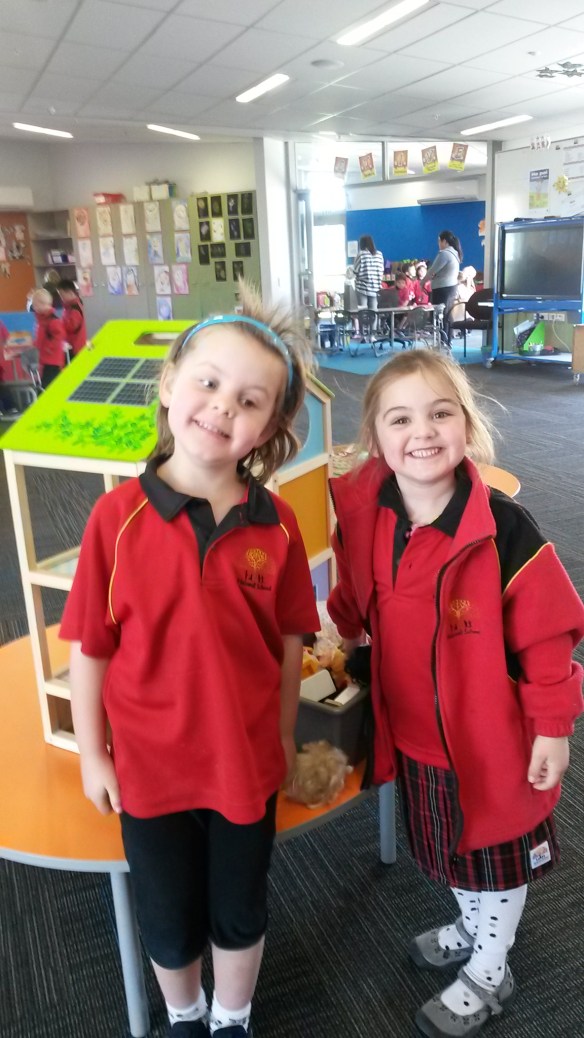 While the kids are adjusting to the classroom, the parents are taken away to the staff room for tea and a talk.  The first week the talk had something to do with the reporting system, stuff I should have known having had Milo in the school for years now, but which I only vaguely recalled.  Another parent asked me about the weekly sausage sizzle, but I was clueless since we have never purchased it for Milo.  I felt more competent during the second week talk, revolving around feeding your kid for school–fruit break, morning tea, and lunch.  Apparently little misunderstandings like eating your sandwich for morning tea can be enough to derail some littlies.  Oh, and make sure they wear shoes they can do up themselves, and that they can get their own clothes down to toilet themselves.  I spent the hour being thankful that my kids are pretty rugged when it comes to transitions.  No credit to me, it’s just their confident personalities.