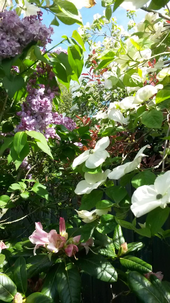 There are old friends—the bare bushy branches have leafed out into a lilac and a dogwood, transporting me back to New York springs of my youth. The rhododendrons ae starting to open their flowers now, and I remember my grandparents’ massive bushes they could see from their kitchen window, with the myrtle underneath.