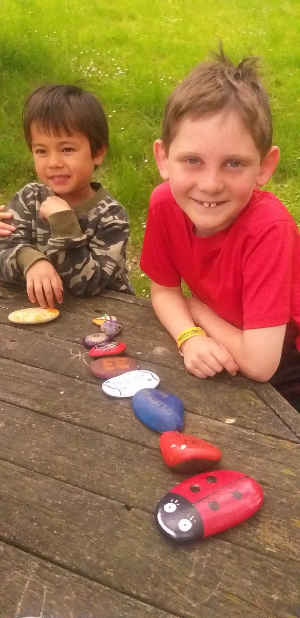 Another day we met some family friends at Halswell Quarry. There are lots of painted rocks hidden around public parks in Christchurch–“Chch rocks.” They are for finding and rehiding for the next kid to discover, and Milo got right into the game.