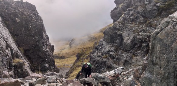 Still, I wanted to give Susanna the experience of a NZ mountain pass, so she and I got up early the next morning and climbed up to Moss pass. We saw a group of chamois scampering over the scree and up some cliffs, their agile babies following nimbly along. The cloud sometimes opened up behind us, and sometimes closed in as we clambered up the stream bed. We peaked into the Durville Valley–there was no hint of the expanse below us through the fog.