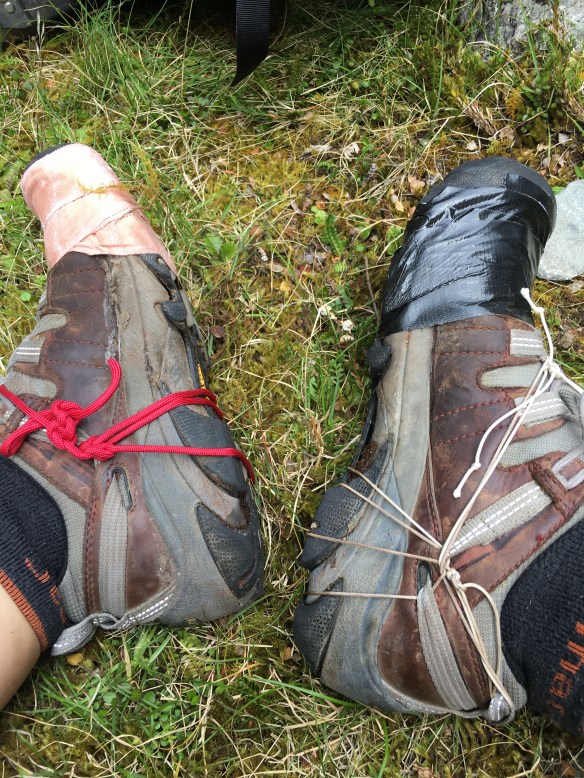 Then we stopped and taped them on. In fact, we tended to those shoes frequently for the rest of the day. Correction: for the rest of the trip.