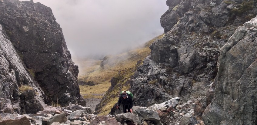Still, I wanted to give Susanna the experience of a NZ mountain pass, so she and I got up early the next morning and climbed up to Moss pass. We saw a group of chamois scampering over the scree and up some cliffs. The cloud sometimes opened up behind us, and sometimes closed in as we clambered up the stream bed. We peaked into the Durville Valley–there was no hint of the expanse below us through the fog.
