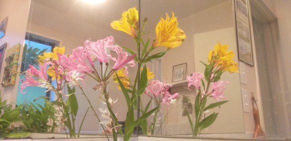Delight of the Day: a vase of flowers. I don’t normally pick flowers for inside because I don’t spend a lot of time in the house, they soon fade, and then I have to throw away flowers which seems so cruel. But one day I accidentally broke off one of those gaudy pink blossoms (Nerine) and figured I might as well put it in a vase. It lasted three long weeks and I enjoyed it multiple times a day. When put the flowers the corner of the bathroom mirror I get 4 for the price of 1!