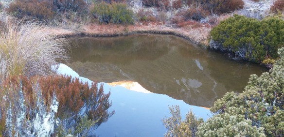 We strolled along the low alpine grasses, and had an early lunch by this frozen tarn. “We should have carried our stuff, we could have gone down the other side to Lake Mavis, and back along the Mingha!” I enthused, regretting that we had to turn back down to the woods so soon. Consulting the map, we realized that I might have been a little over-enthusiastic with that plan. It would be a fantastic mission some day, but we had a whole lot more ridge to go along before we could even see Lake Mavis.