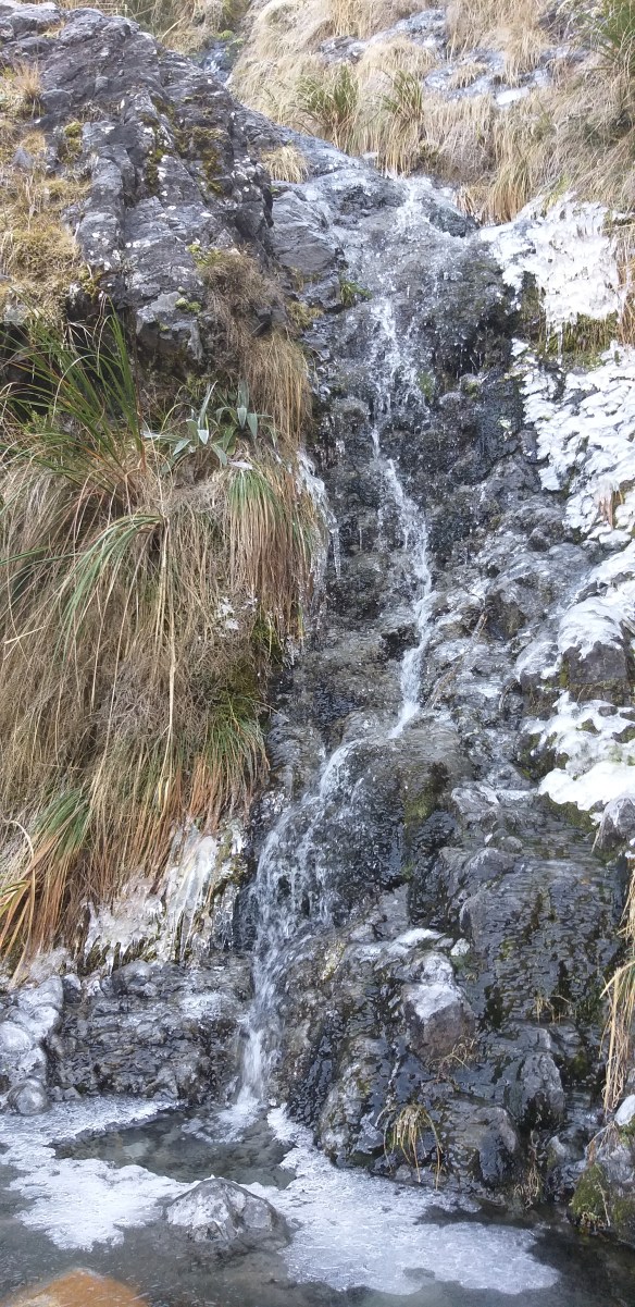Carrie’s husband gets excited about routes and maps, and he had picked out a creek bed near the hut that, based on the aerial photos and the topo maps, should be climbable without needing any technical gear, as long as we exited the creek bed before the bluffs at the top. We left most of our stuff in the hut and set off with day packs, crossing the river and pushing through a little bit of friendly scrub to the frosty creek. Just for reference, “unfriendly” scrub would involve the well-armored matagouri and speargrass, which we luckily didn’t encounter. Jeremiah often comes home from his hunting trips picking bits of thorns out of his skin, but “bush bashing” through spines and prickles holds no appeal for me!