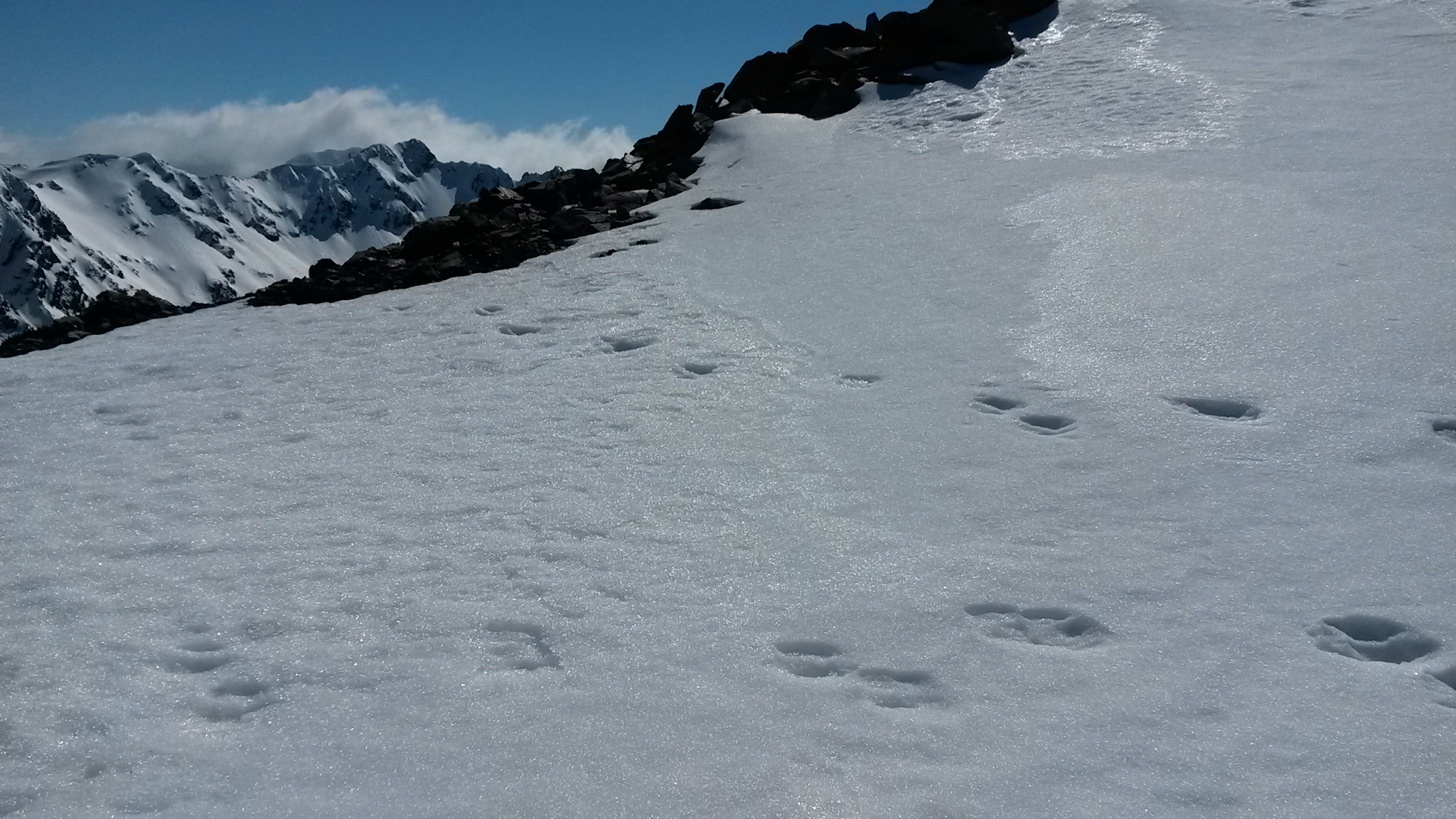 Except a pair of tahr. Or chamois…or deer. I’m really not knowledgeable enough to guess who’s footprints these were, or why they were sidling along the mountain tops.