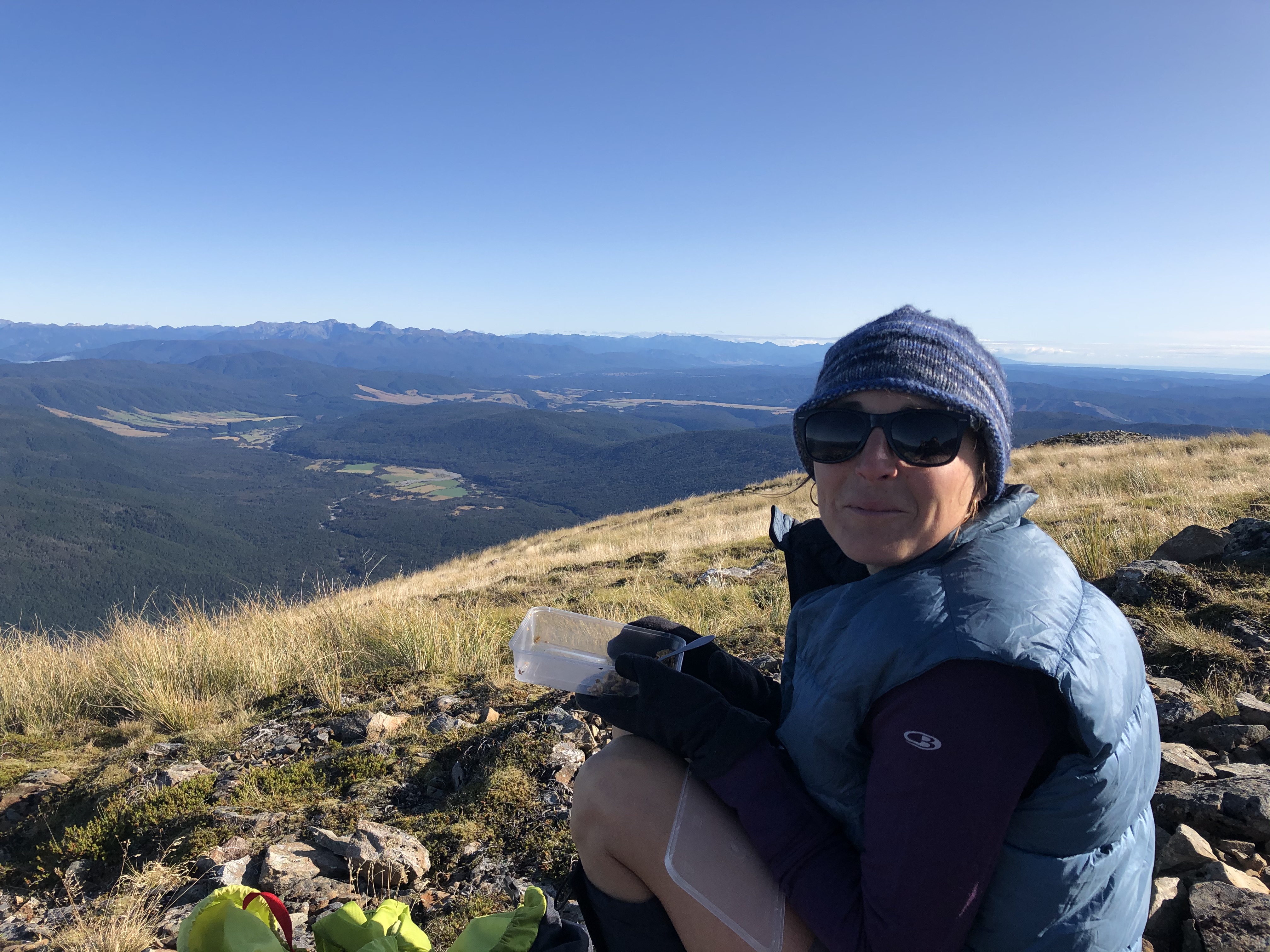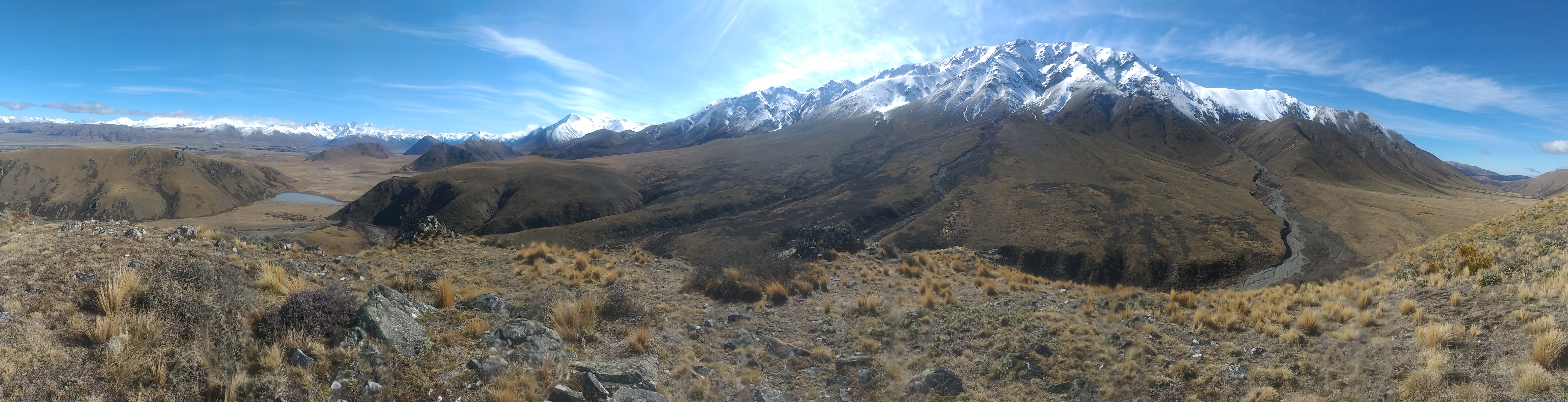 Popping out of the trees, I could see the road far below, and hear the train’s whistle. Not exactly back country, but the views were panoramic nevertheless. I climbed through the tussock and reached the first bit of the rocky ridge. The drop down to the right was a startlingly steep scree slope, so I kept left as much as possible. Patches of snow began to appear, but they were soft and safe in the sun. I reached a high point after a cautiously poking my way along a cornice, comfortingly solid under my stick. I checked my phone—reception, and data too. I sent Jeremiah a text. “I’m on the small peak before bealey, going well. I’m going to tootle along a bit more and check out the next ridge.” I might as well keep him updated, he was probably afraid of being left to raise two young kids on his own.