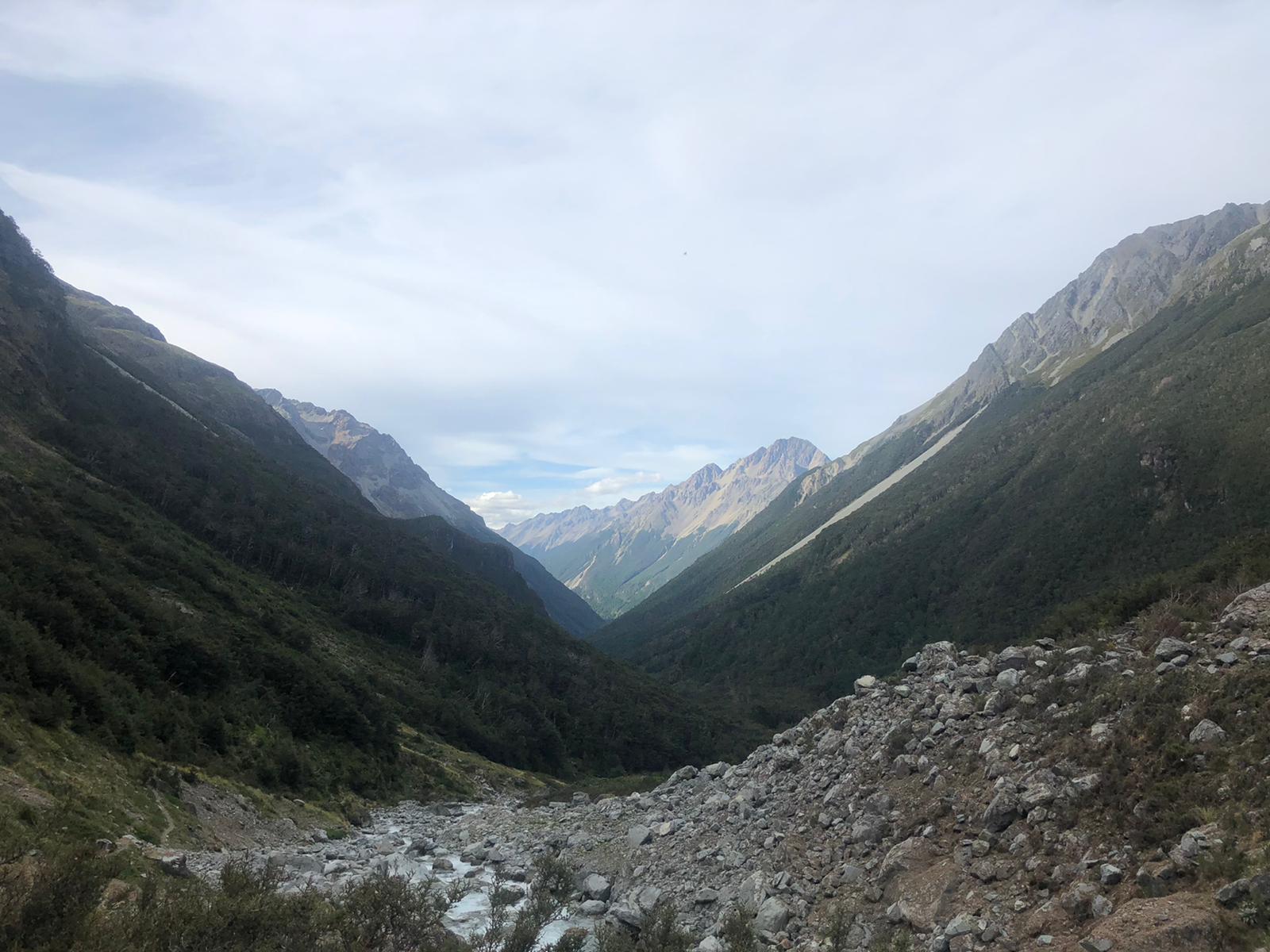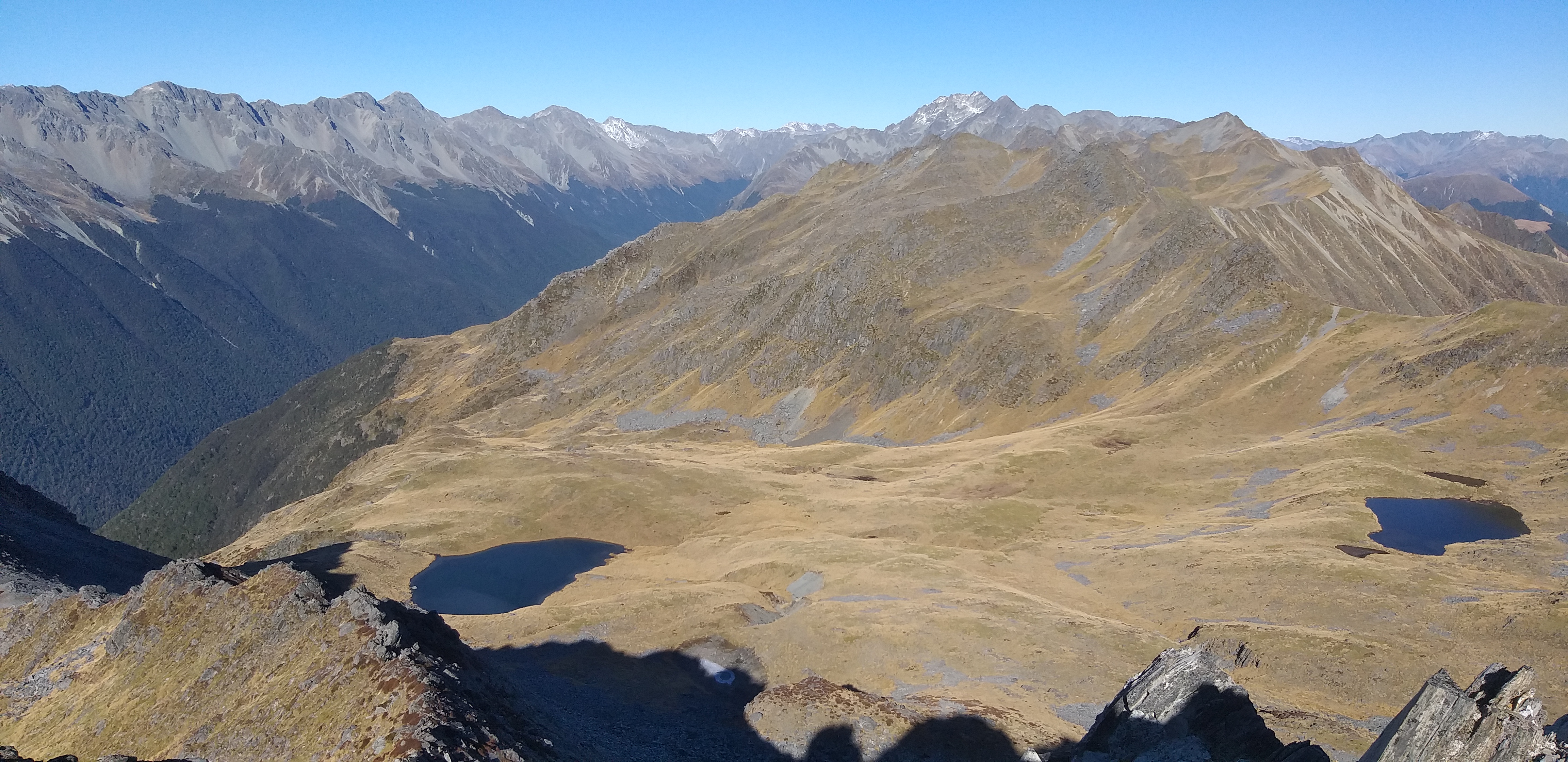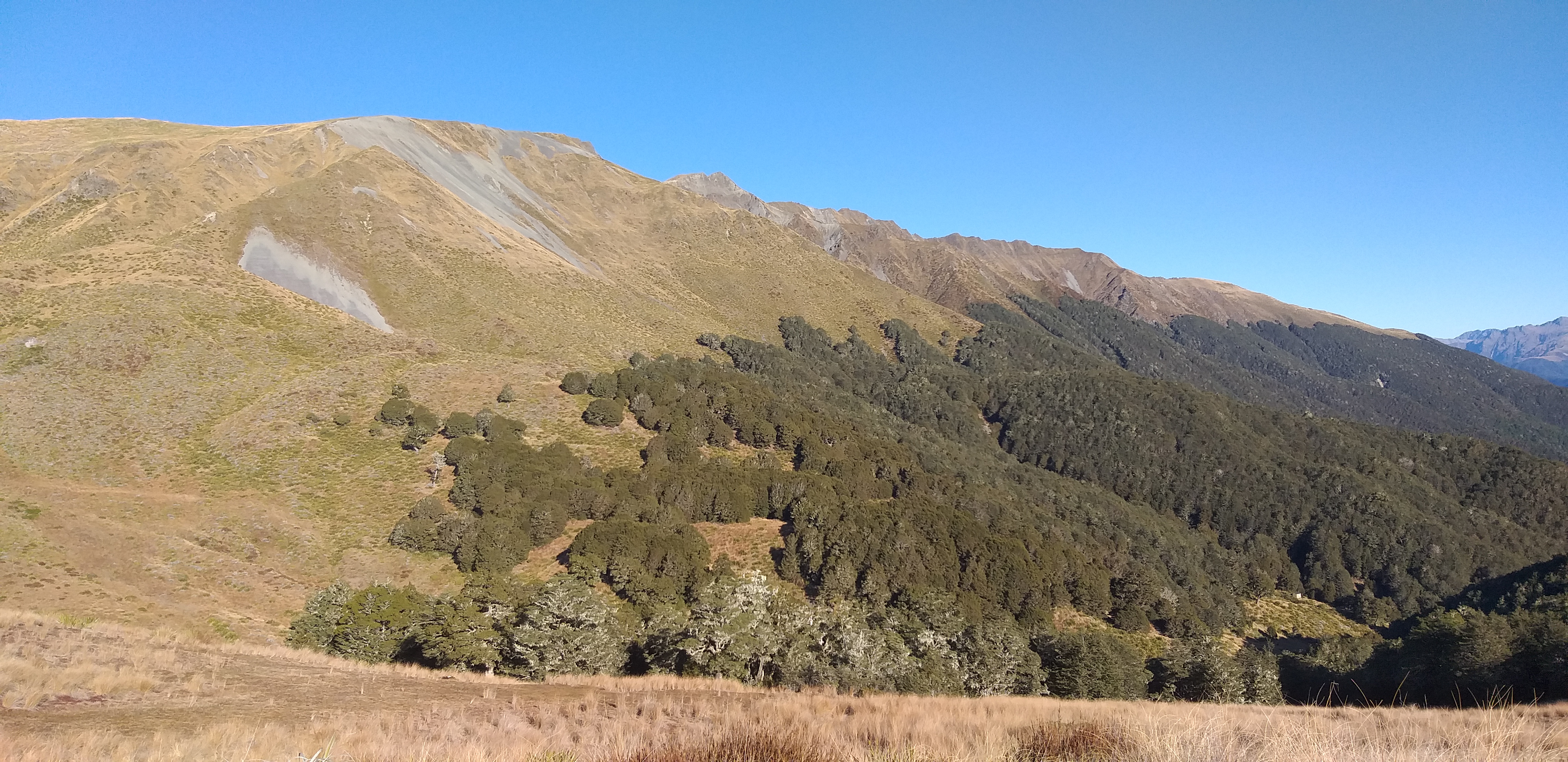 It was sunny by the time I arrived in Arthur’s pass the next morning. Cold, but a steep climb soon fixed that. I heard a kea’s screechy call, and admired the long waterfalls coming off the snow-capped peaks. The route description had said that there was no other safe way down this side than the ridge, and looking at the bluffs, I believed it.