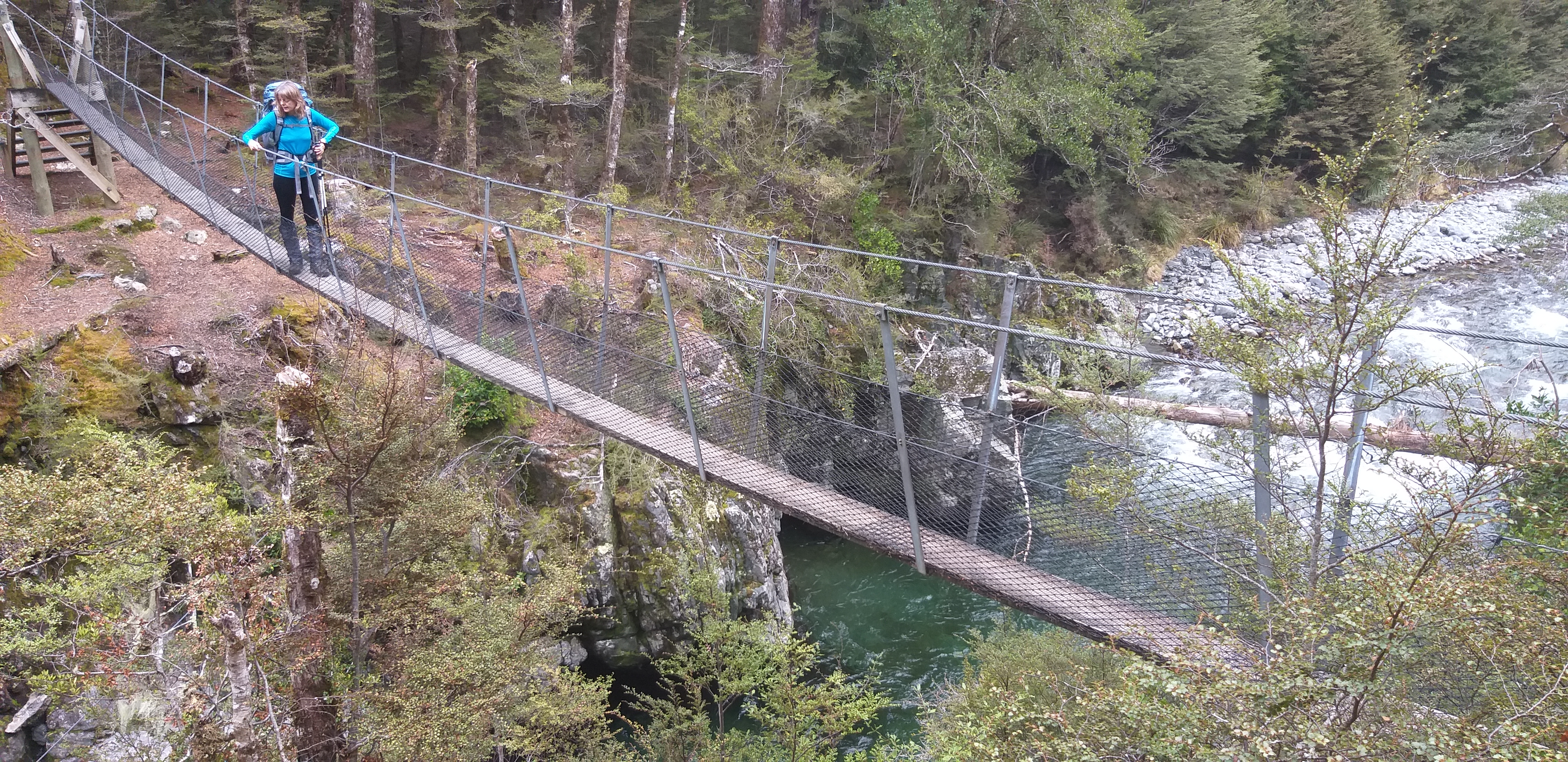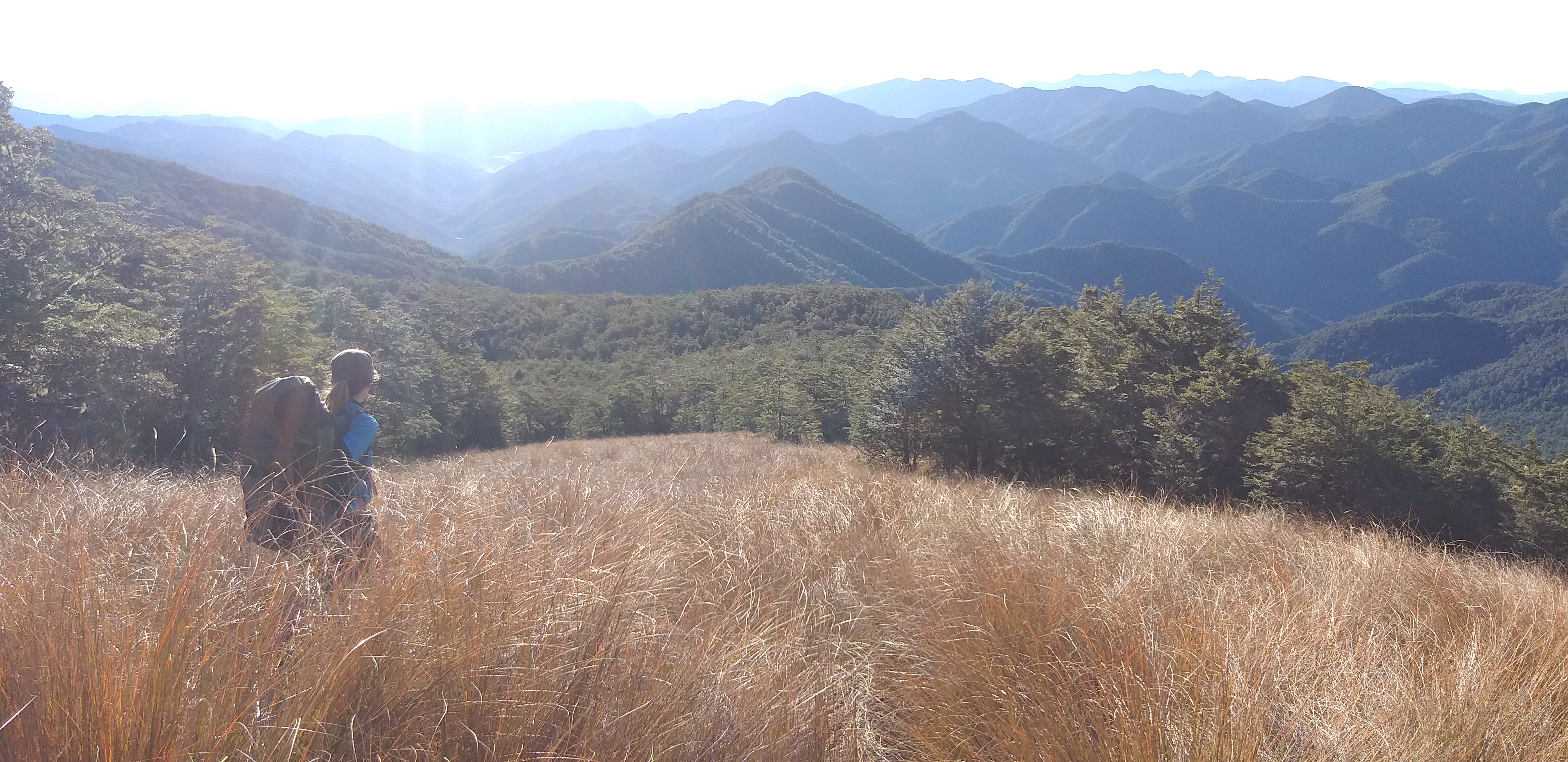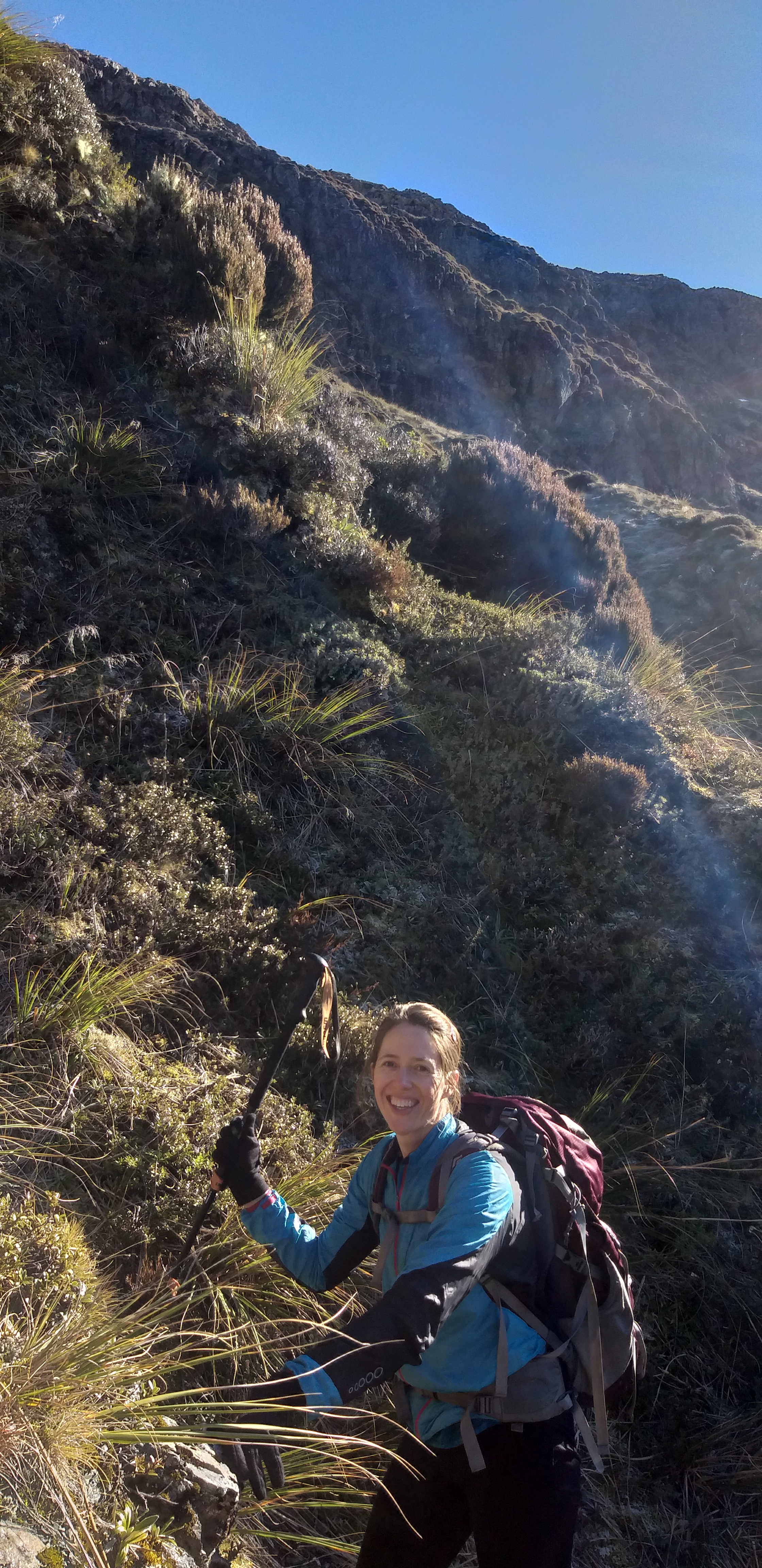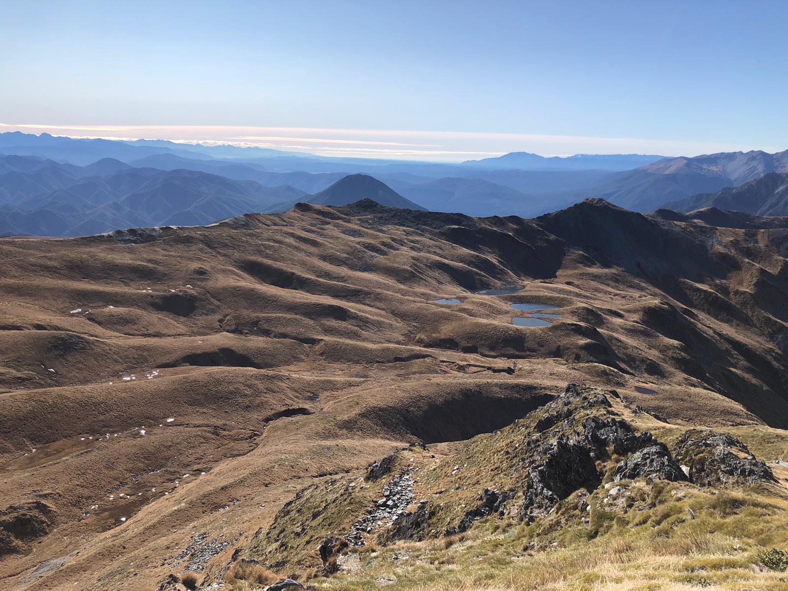 It was sunny by the time I arrived in Arthur’s pass the next morning. Cold, but a steep climb soon fixed that. I heard a kea’s screechy call, and admired the long waterfalls coming off the snow-capped peaks. The route description had said that there was no other safe way down this side than the ridge, and looking at the bluffs, I believed it.