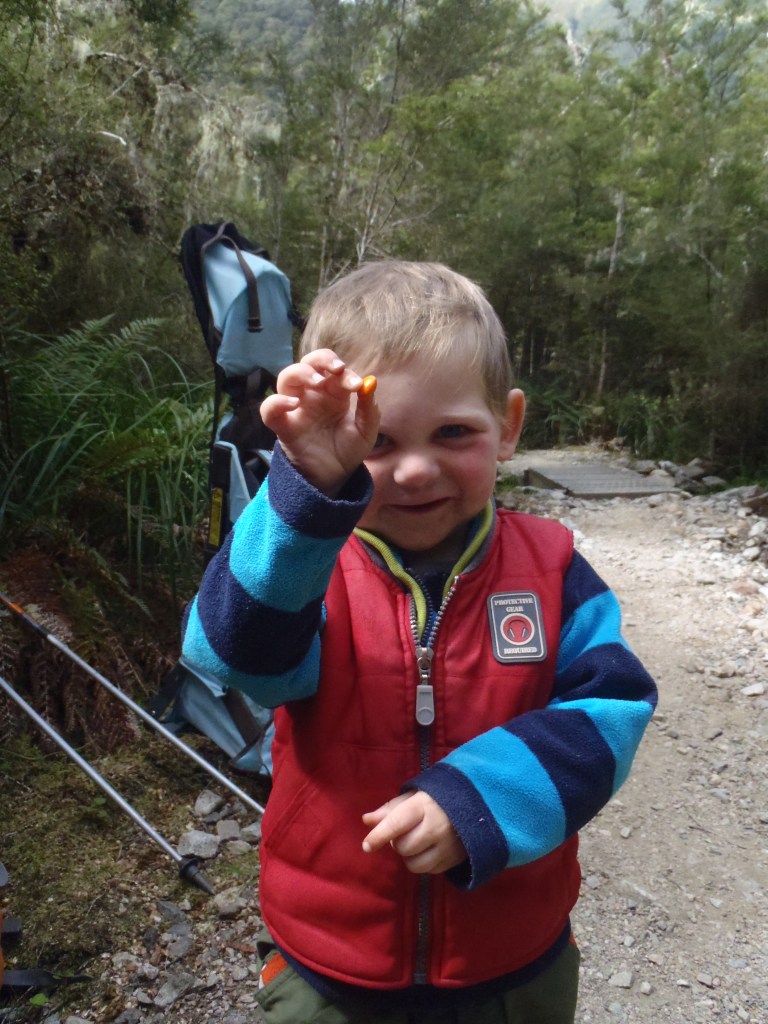 Sometimes I got tired of riding in the backpack and started to make whiny noises and sign with my hands that I was “all done” riding for the day. If we weren’t quite at our destination (a hut), Mama and Daddy would stop and give me some M&M’s, and maybe I’d do a little walking by myself. This here is an Orange M&M, orange like Daddy’s backpack. I also ate Red-like-daddy’s-shirt M&M’s and Blue-like-hat M&M’s and Green-like-leaves M&M’s. They all taste good to me.